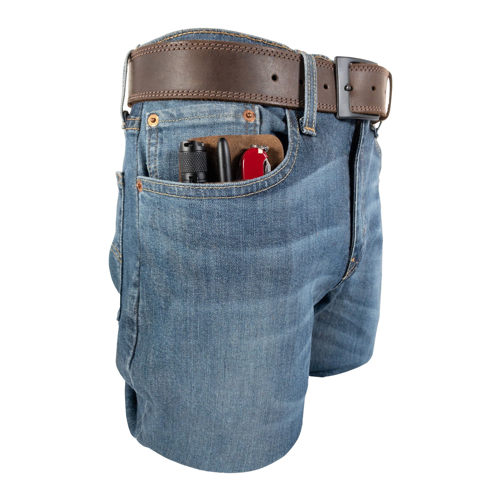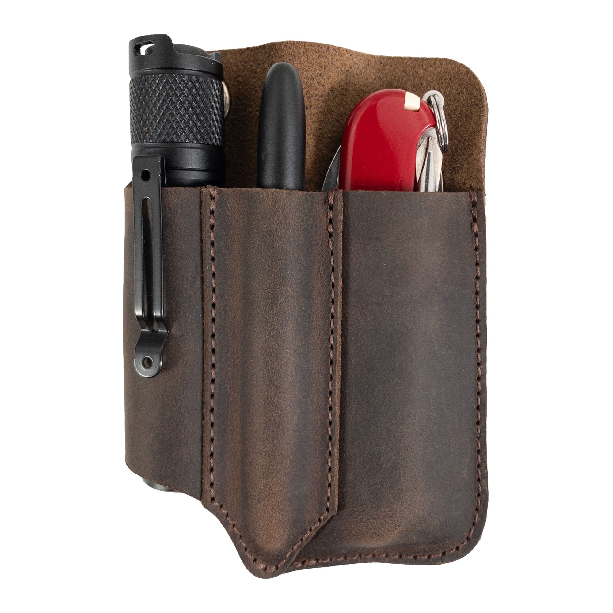 The Compact EDC Tool Holster is designed to accommodate all your tools securely, thanks to its snug design. With a practical pocket case, you can easily access all your items without fumbling. Each holster is fire branded, adding a touch of artisanal flair that complements its rugged appearance.