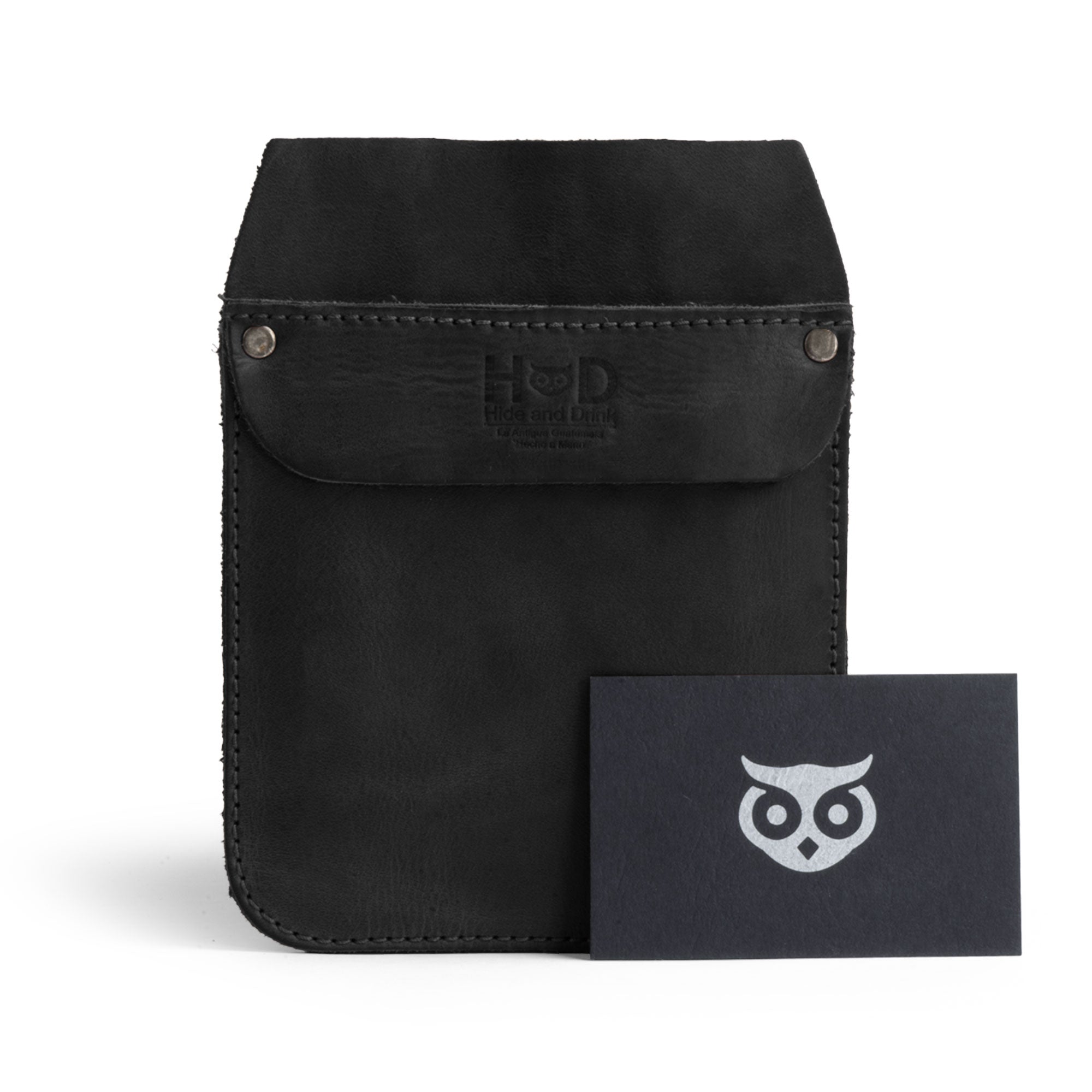 Hide & Drink Leather Work Pocket paired with a business card, highlighting its stylish finish. Perfect for storing pens and tools, this Leather Work Pocket embodies quality craftsmanship, made with artisan skills in La Antigua Guatemala.