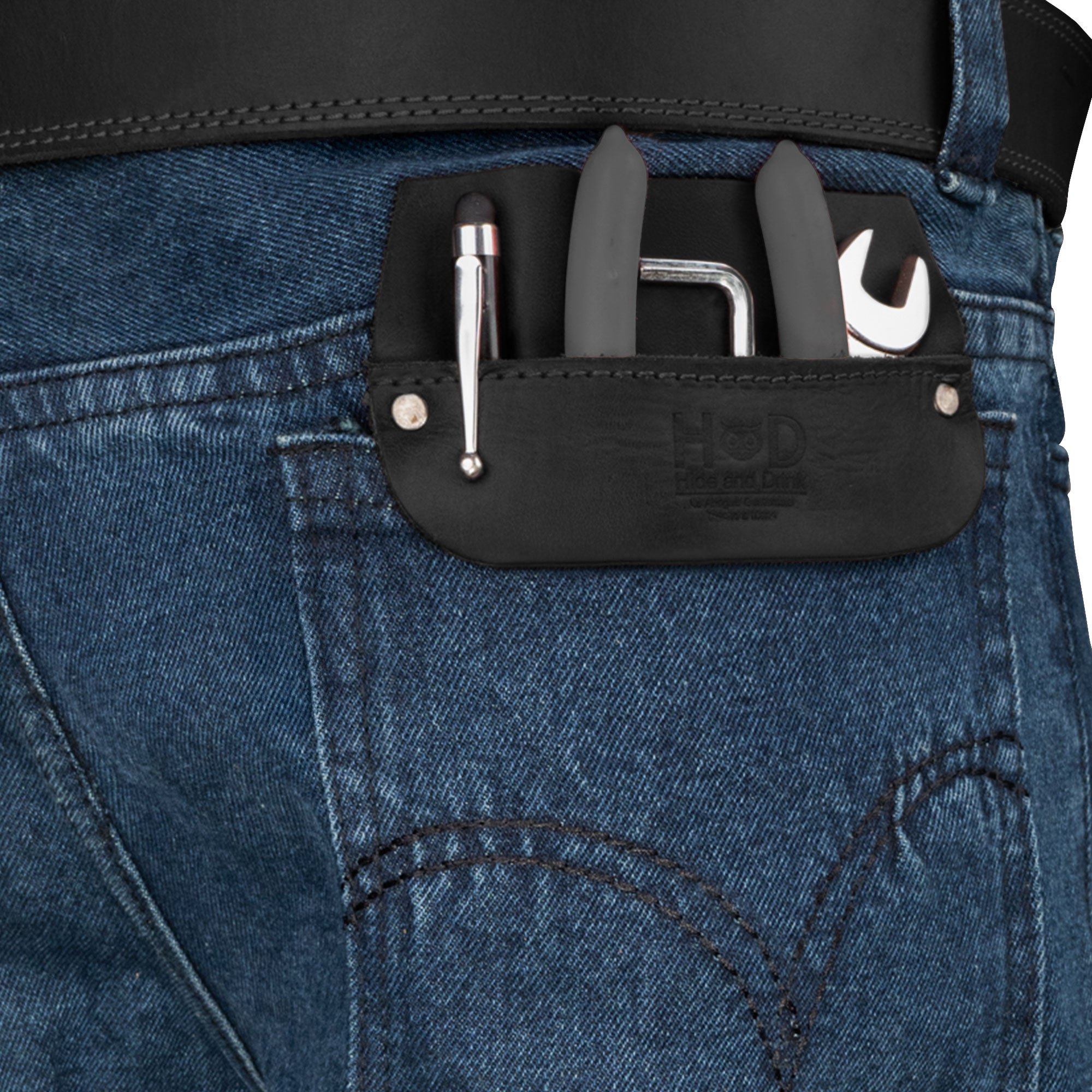 Hide & Drink Leather Work Pocket displayed in a jeans back pocket, illustrating its practical usage for carrying job tools. This versatile Work Pocket Organizer for Tools boasts artisan quality with Fire Branded workmanship from La Antigua Guatemala.