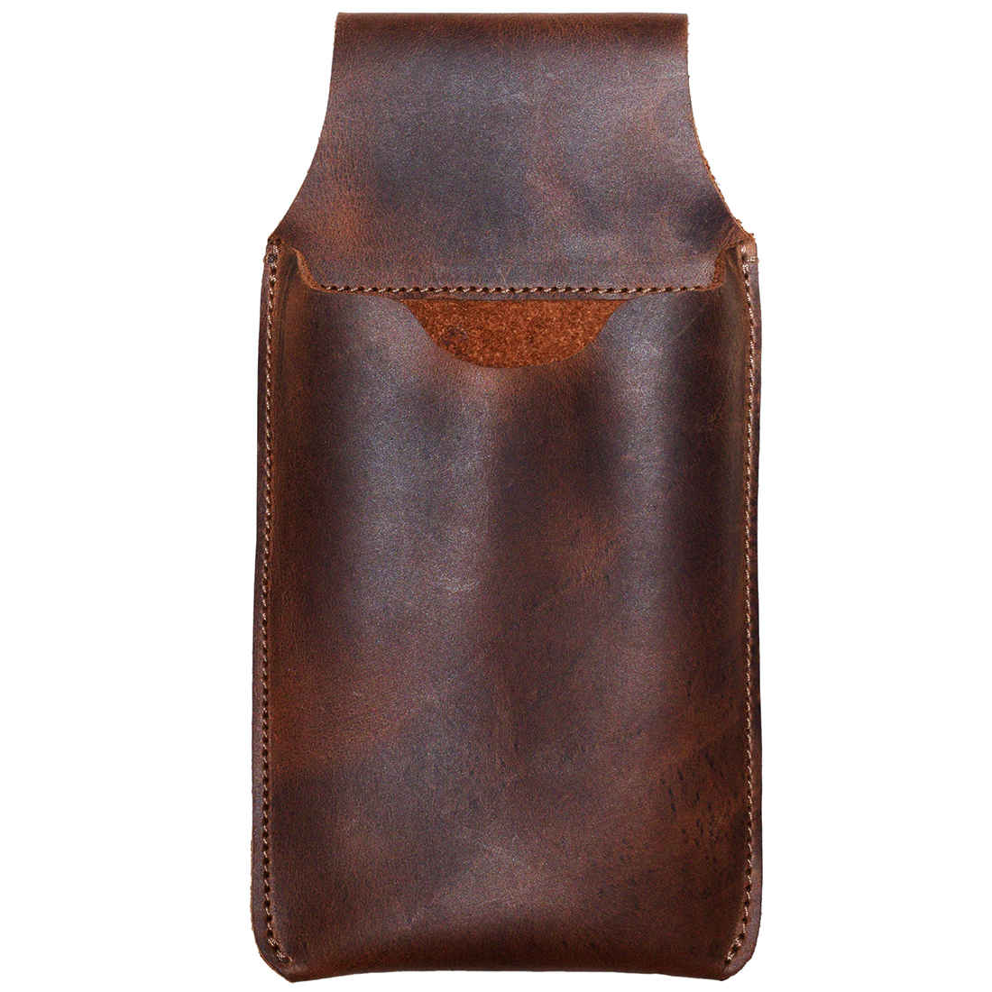 Front view of Hide & Drink's Waist Phone Holder, emphasizing its sleek design and Full Grain Leather texture. This versatile Cellphone Sleeve with Belt Loop for Waist provides secure phone protection, handmade by skilled artisans in La Antigua Guatemala & Oaxaca Mexico, showcasing the beauty of hand cut and hand sewn techniques.