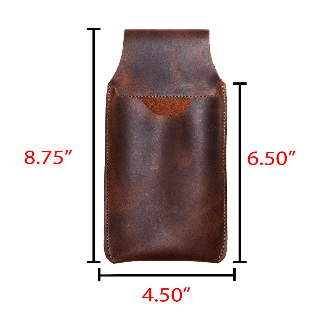 Dimensions of Hide & Drink's Waist Phone Holder displayed for customer reference. Showcasing its Full Grain Leather material, this Cellphone Sleeve with Belt Loop for Waist is an embodiment of quality craftsmanship. Handmade in La Antigua Guatemala & Oaxaca Mexico, featuring artisan techniques like hand cutting, hand sewing and fire branding.
