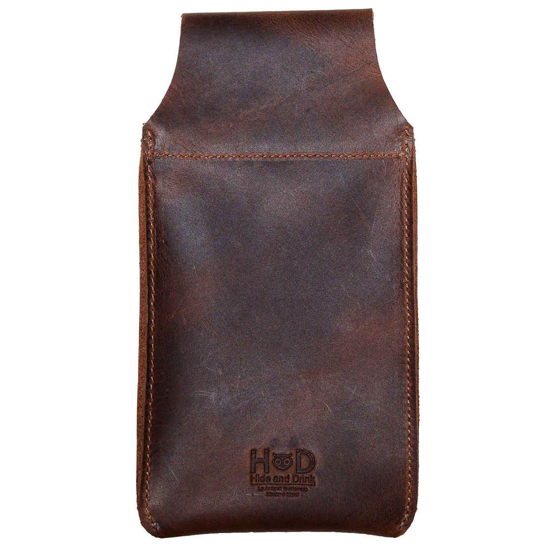 Back of the Hide & Drink Waist Phone Holder showcasing its minimalist design and brand logo. Made from Full Grain Leather, this Cellphone Sleeve with Belt Loop for Waist offers durability and style. Each piece is handcrafted with care in La Antigua Guatemala & Oaxaca Mexico, embodying the essence of artisan craftsmanship in small batch production.