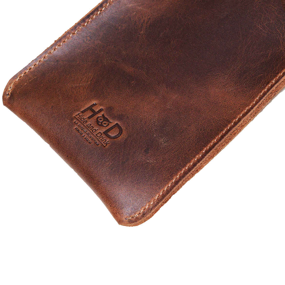 Close-up of the Hide & Drink Waist Phone Holder showcasing its Full Grain Leather construction, a perfect Cellphone Sleeve with Belt Loop for Waist, designed to securely protect your phone. This Handmade product from artisans in La Antigua Guatemala & Oaxaca Mexico is meticulously hand cut and hand sewn, ensuring a durable design that exudes quality.