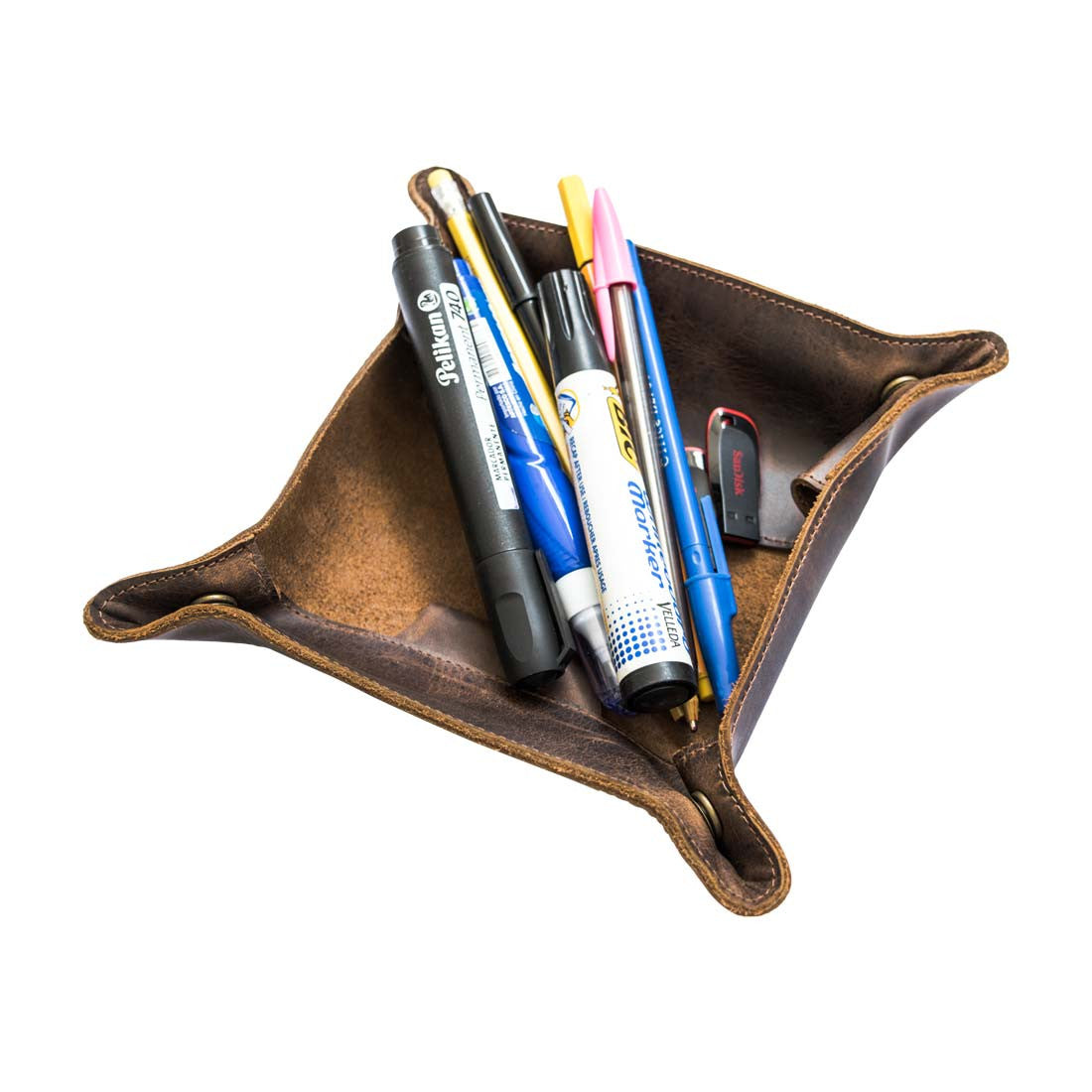 This handmade genuine leather Valet Tray has plenty of storage for pens, markers, pencils, keys and other miscellaneous items. Since it doubles up as a Pencil Case, this item is perfect for when you're in your office and when you're on the go. Easy to construct and collapse with rustic brass metal snaps giving it a sturdy shape, this a great, stylish addition to your work space.