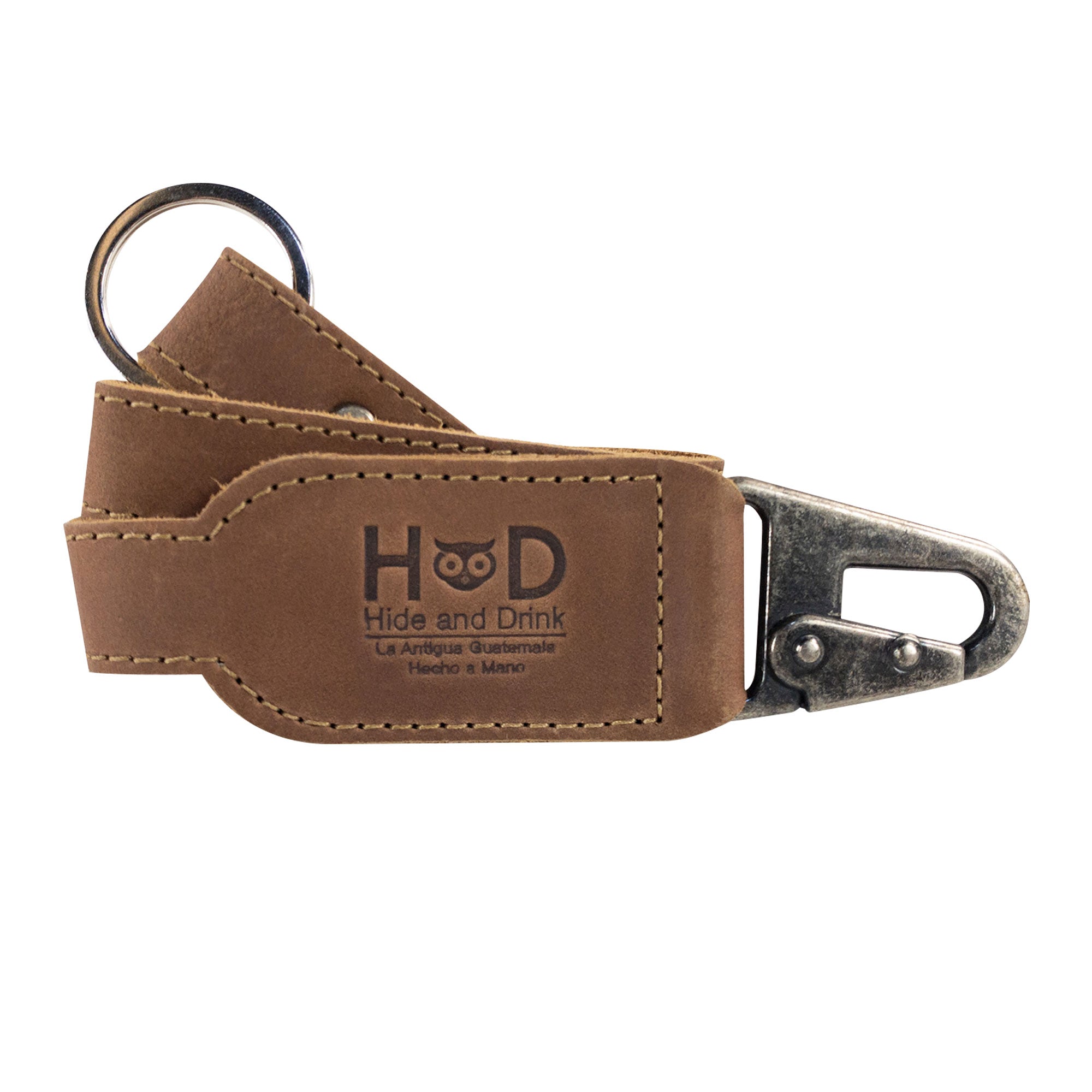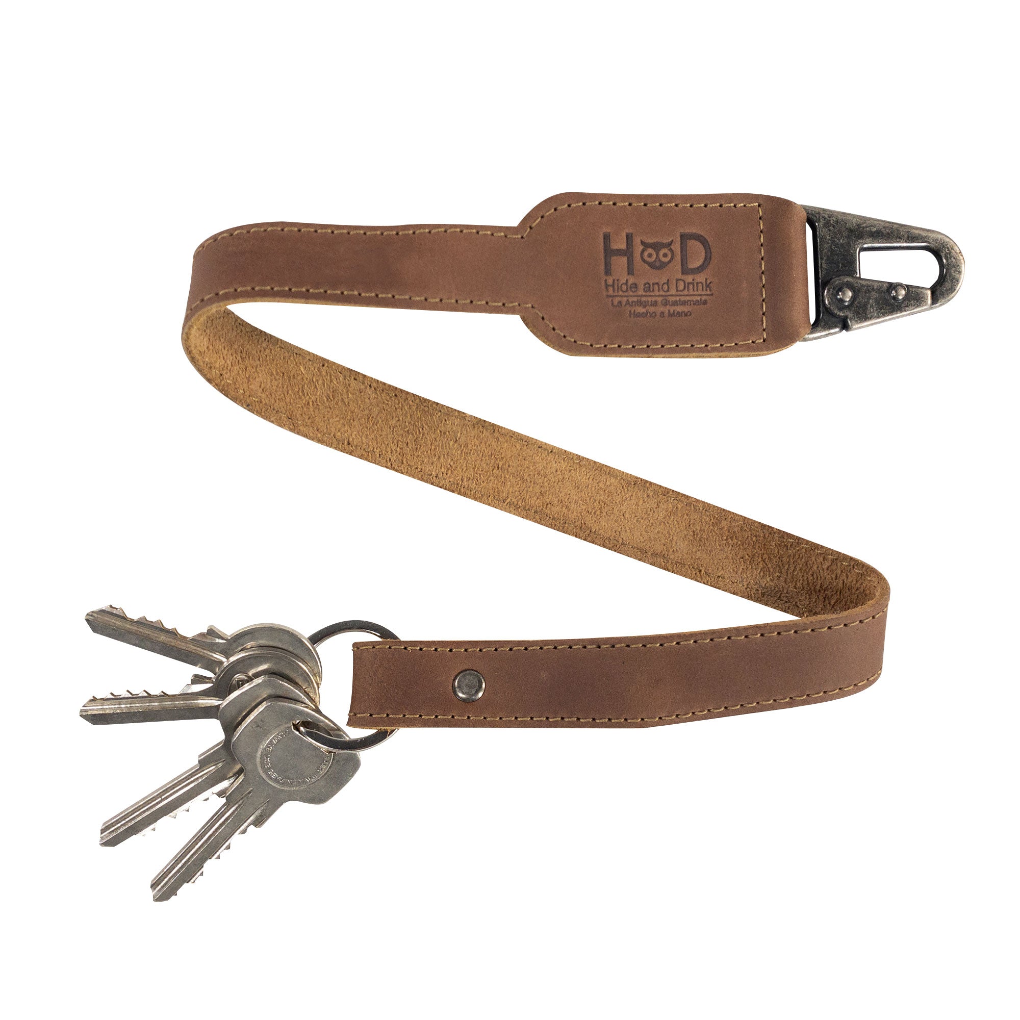 Hide & Drink Keychain Lanyard designed for convenience and style, made from Full Grain Leather. It includes a clip to easily attach to house, car, and apartment keys. This handmade item emphasizes small batch production, fire branded details, and artisan craftsmanship from La Antigua Guatemala.