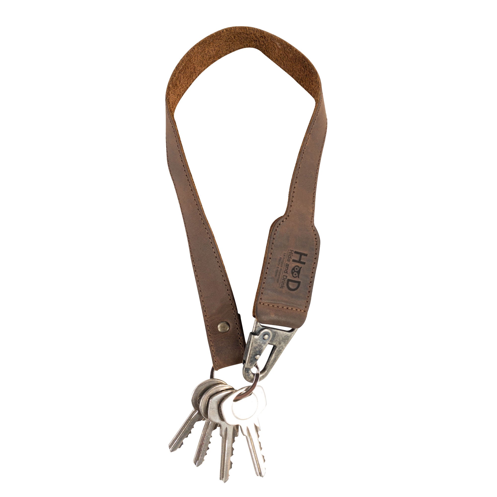 Hide & Drink Keychain Lanyard featuring rustic Full Grain Leather, providing a sleek clip for attaching your keys. This stylish accessory reflects small batch production and skillful artisan methods used in La Antigua Guatemala.