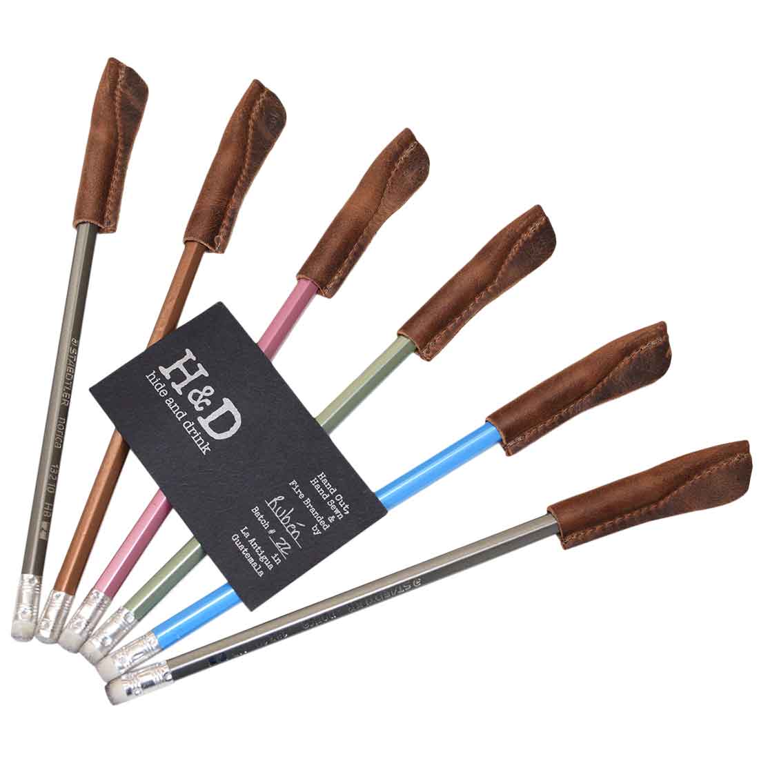 Showcase of Hide & Drink's Pencil Cap (6 Pack) featuring a set of 6 stylish pencil caps made from full grain leather, perfect for pencil lead protection. These pencil caps are essential office accessories, hand cut and hand sewn with quality craftsmanship from artisans in La Antigua Guatemala & Oaxaca Mexico.