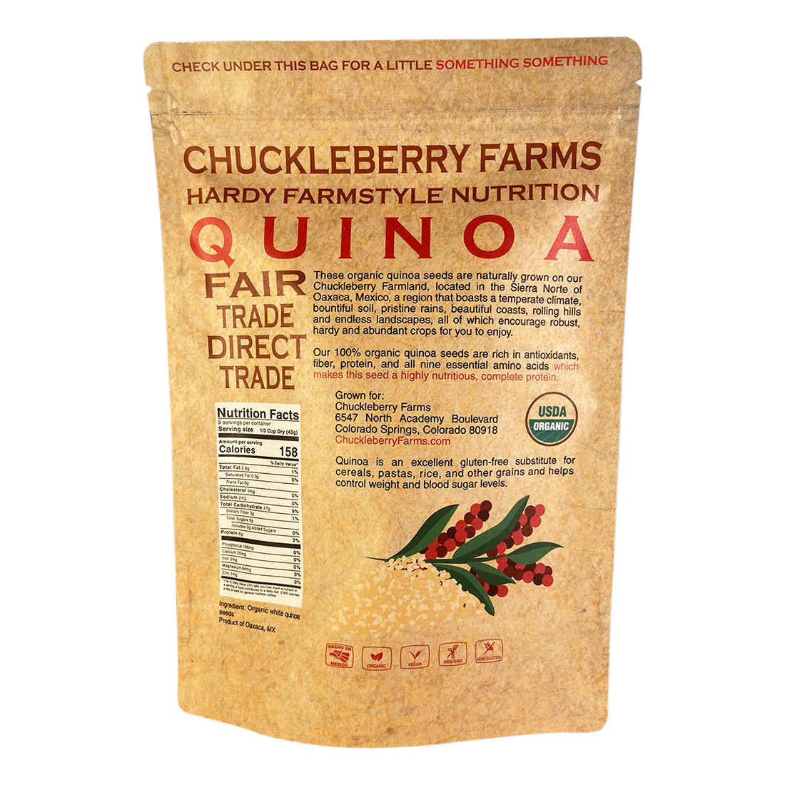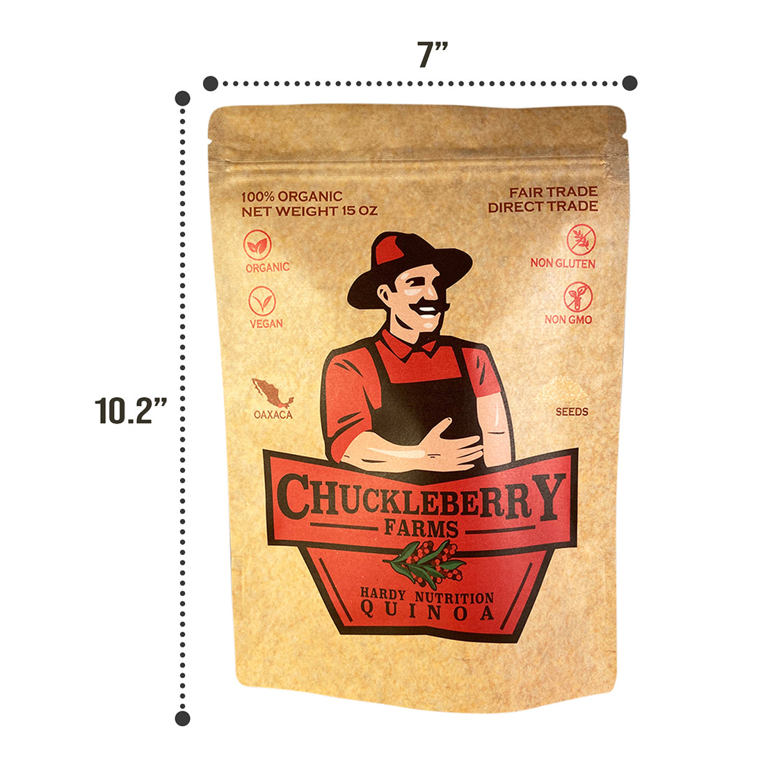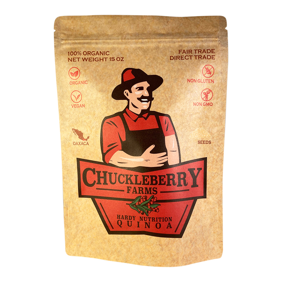 • FAIR TRADE DIRECT TRADE: We at Chuckleberry Farms believe in hardy farmstyle nutrition. We grow our quinoa on our Chuckleberry Farmland, working with our local farmers in Oaxaca, Mexico. We cultivate all of our produce sustainably in a region that boasts a temperate climate, bountiful soil, pristine rains, beautiful coasts, rolling hills and endless landscapes, all of which encourage robust, hardy and abundant crops for you to enjoy.